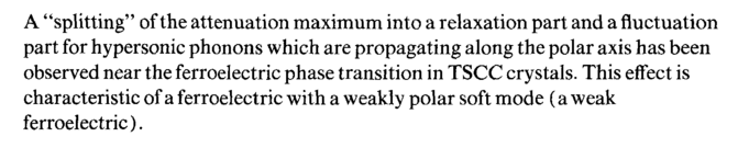 A "splitting" of the attenuation maximum into a relaxation part and a fluctuation part for hypersonic phonons which are propagating along the polar axis has been observed near the ferroelectric phase transition in TSCC crystals. This effect is characteristic of a ferroelectric with a weakly polar soft mode (a weak ferroelectric).