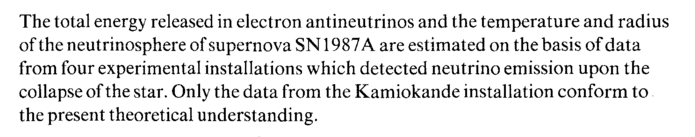 The total energy released in electron antineutrinos and the temperature and radius of the neutrinosphere of supernova SN1987A are estimated on the basis of data from four experimental installations which detected neutrino emission upon the collapse of the star. Only the data from the Kamiokande installation conform to the present theoretical understanding.