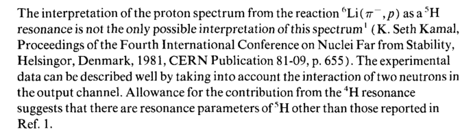 The interpretation of the proton spectrum from the reaction 6Ы(тг~,р) as a5H resonance is not the only possible interpretation of this spectrum1 (K. Seth Kamal, Proceedings of the Fourth International Conference on Nuclei Far from Stability, Helsingor, Denmark, 1981, CERN Publication 81-09, p. 655). The experimental data can be described well by taking into account the interaction of two neutrons in the output channel. Allowance for the contribution from the 4H resonance suggests that there are resonance parameters of 5H other than those reported in Ref. 1.