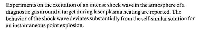 Experiments on the excitation of an intense shock wave in the atmosphere of a diagnostic gas around a target during laser plasma heating are reported. The behavior of the shock wave deviates substantially from the self-similar solution for an instantaneous point explosion.