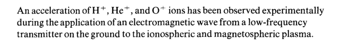 An acceleration of H+, He+, and O4" ions has been observed experimentally during the application of an electromagnetic wave from a low-frequency transmitter on the ground to the ionospheric and magnetospheric plasma.