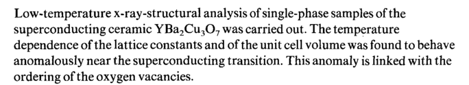 Low-temperature x-ray-structural analysis of single-phase samples of the superconducting ceramic YBa2Cu307 was carried out. The temperature dependence of the lattice constants and of the unit cell volume was found to behave anomalously near the superconducting transition. This anomaly is linked with the ordering of the oxygen vacancies.