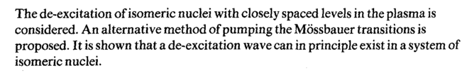 The de-excitation of isomeric nuclei with closely spaced levels in the plasma is considered. An alternative method of pumping the Mossbauer transitions is proposed. It is shown that a de-excitation wave can in principle exist in a system of isomeric nuclei.