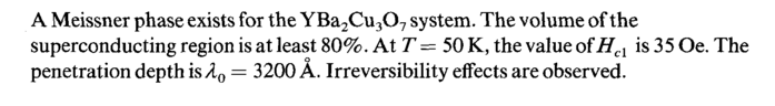 A Meissner phase exists for the YBa2Cu307 system. The volume of the superconducting region is at least 80%. At Τ = 50 К, the value of Hcl is 3 5 Oe. The о penetration depth is λ0 = 3200 A. Irreversibility effects are observed.