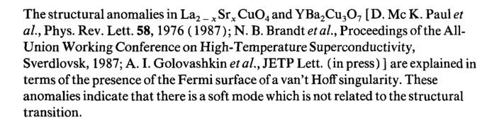 The structural anomalies in La2 _ x Srx Cu04 and YBa2Cu307 [ D. Mc K. Paul et aL, Phys. Rev. Lett. 58,1976 (1987); N. B. Brandt etaL, Proceedings of the All-Union Working Conference on High-Temperature Superconductivity, Sverdlovsk, 1987; A. I. Golovashkin etal.y JETP Lett, (in press) ] are explained in terms of the presence of the Fermi surface of a van't Hoff singularity. These anomalies indicate that there is a soft mode which is not related to the structural transition.