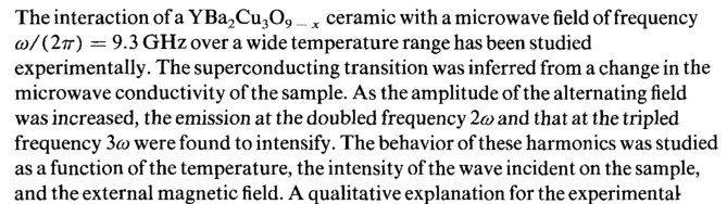 The interaction of a YBa2Cu309 _ x ceramic with a microwave field of frequency ω/ (2ir) =9.3 GHz over a wide temperature range has been studied experimentally. The superconducting transition was inferred from a change in the microwave conductivity of the sample. As the amplitude of the alternating field was increased, the emission at the doubled frequency 2ω and that at the tripled frequency 3ω were found to intensify. The behavior of these harmonics was studied as a function of the temperature, the intensity of the wave incident on the sample, and the external magnetic field. A qualitative explanation for the experimental