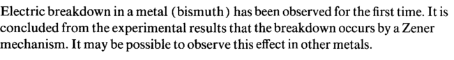Electric breakdown in a metal (bismuth) has been observed for the first time. It is concluded from the experimental results that the breakdown occurs by a Zener mechanism. It may be possible to observe this effect in other metals.