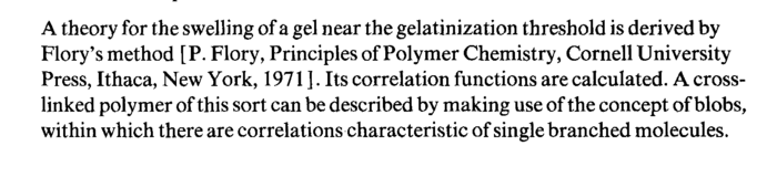 A theory for the swelling of a gel near the gelatinization threshold is derived by Flory's method [P. Flory, Principles of Polymer Chemistry, Cornell University Press, Ithaca, New York, 1971 ]. Its correlation functions are calculated. A cross-linked polymer of this sort can be described by making use of the concept of blobs, within which there are correlations characteristic of single branched molecules.