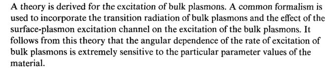 A theory is derived for the excitation of bulk plasmons. A common formalism is used to incorporate the transition radiation of bulk plasmons and the effect of the surface-plasmon excitation channel on the excitation of the bulk plasmons. It follows from this theory that the angular dependence of the rate of excitation of bulk plasmons is extremely sensitive to the particular parameter values of the material.