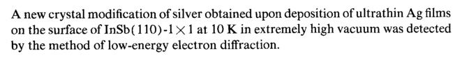 A new crystal modification of silver obtained upon deposition of ultrathin Ag films on the surface of InSb( 110)-1 X 1 at 10 К in extremely high vacuum was detected by the method of low-energy electron diffraction.