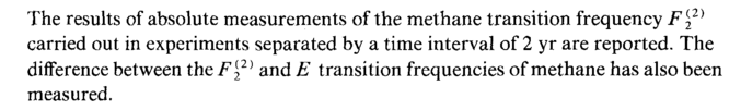 The results of absolute measurements of the methane transition frequency F£2) carried out in experiments separated by a time interval of 2 yr are reported. The difference between the F{22) and Ε transition frequencies of methane has also been measured.