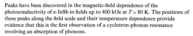 Peaks have been discovered in the magnetic-field dependence of the photoconductivity of я-InSb in fields up to 400 kOe at T> 80 K. The positions of these peaks along the field scale and their temperature dependence provide evidence that this is the first observation of a cyclotron-phonon resonance involving an absorption of phonons.