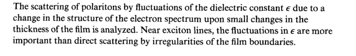 The scattering of polaritons by fluctuations of the dielectric constant € due to a change in the structure of the electron spectrum upon small changes in the thickness of the film is analyzed. Near exciton lines, the fluctuations in € are more important than direct scattering by irregularities of the film boundaries.
