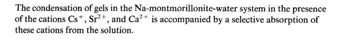 The condensation of gels in the Na-montmorillonite-water system in the presence of the cations Cs+, Sr2+, and Ca2+ is accompanied by a selective absorption of these cations from the solution.