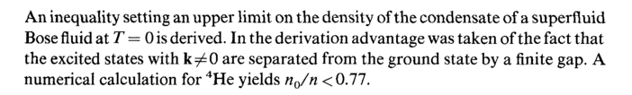 An inequality setting an upper limit on the density of the condensate of a superfmid Bose fluid at Τ ~ 0 is derived. In the derivation advantage was taken of the fact that the excited states with к φ 0 are separated from the ground state by a finite gap. A numerical calculation for 4He yields n0/n <0.77.