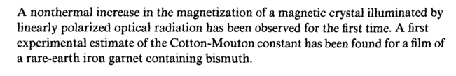 A nonthermal increase in the magnetization of a magnetic crystal illuminated by linearly polarized optical radiation has been observed for the first time. A first experimental estimate of the Cotton-Mouton constant has been found for a film of a rare-earth iron garnet containing bismuth.