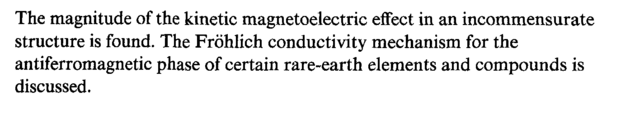 The magnitude of the kinetic magnetoelectric effect in an incommensurate structure is found. The Frohlich conductivity mechanism for the antiferromagnetic phase of certain rare-earth elements and compounds is discussed.
