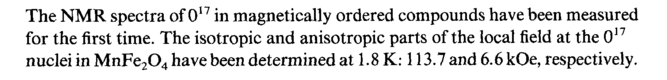 The NMR spectra of 017 in magnetically ordered compounds have been measured for the first time. The isotropic and anisotropic parts of the local field at the 017 nuclei in MnFe204 have been determined at 1.8 К: 113.7 and 6.6 kOe, respectively.