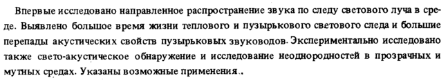 Впервые исследовано направленное распространение звука по следу светового луча в среде. Выявлено большое время жизни теплового и пузырькового светового следа и большие перепады акустических свойств пузырьковых звуководов. Экспериментально исследовано также свето-акустическое обнаружение и исследование неоднородностей в прозрачных и мутных средах. Указаны возможные применения,.