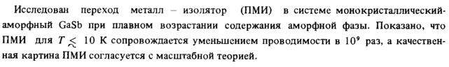 Исследован переход металл изолятор (ПМИ) в системе м оно кристаллический-аморфный GaSb при плавном возрастании содержания аморфной фазы. Показано, что ПМИ для Τ < 10 К сопровождается уменьшением проводимости в 109 раз, а качественная картина ПМИ согласуется с масштабной теорией.