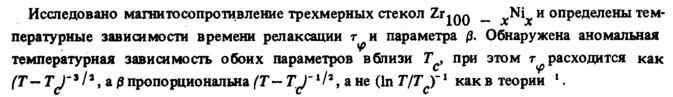 Исследовано магни то сопротивление трехмерных стекол Zr ^qq _ ^Ni^ и определены температурные зависимости времени релаксации т^и параметра 0. Обнаружена аномальная температурная зависимость обоих параметров вблизи Т^ при этом расходится как /Т-ГJ"5/2, а/3 пропорциональна (Т ТУ112, а не (In Т/ТУ1 как в теории 1.