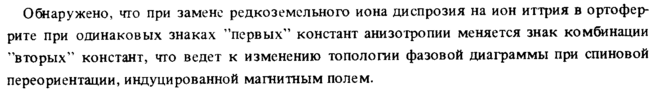 Обнаружено, что при замене редкоземельного иона диспрозия на ион иттрия в ортофер-рите при одинаковых знаках "первых" констант анизотропии меняется знак комбинации "вторых" констант, что ведет к изменению топологии фазовой диаграммы при спиновой переориентадии, индуцированной магнитным полем.