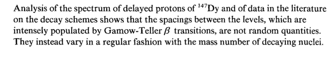 Analysis of the spectrum of delayed protons of Dy and of data in the literature on the decay schemes shows that the spacings between the levels, which are intensely populated by Gamow-Teller β transitions, are not random quantities. They instead vary in a regular fashion with the mass number of decaying nuclei.
