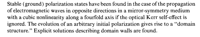 Stable (ground) polarization states have been found in the case of the propagation of electromagnetic waves in opposite directions in a mirror-symmetry medium with a cubic nonlinearity along a fourfold axis if the optical Kerr self-effect is ignored. The evolution of an arbitrary initial polarization gives rise to a "domain structure." Explicit solutions describing domain walls are found.