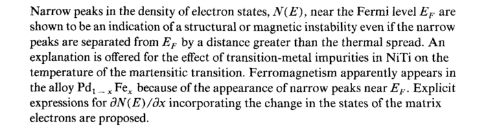 Narrow peaks in the density of electron states, N(E), near the Fermi level EF are shown to be an indication of a structural or magnetic instability even if the narrow peaks are separated from EF by a distance greater than the thermal spread. An explanation is offered for the effect of transition-metal impurities in NiTi on the temperature of the martensitic transition. Ferromagnetism apparently appears in the alloy J*dx _ x Fex because of the appearance of narrow peaks near EF. Explicit expressions for dN{E)/dx incorporating the change in the states of the matrix electrons are proposed.