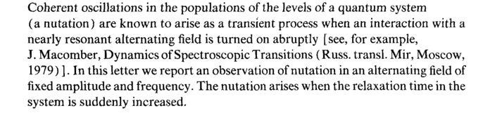 Coherent oscillations in the populations of the levels of a quantum system (a nutation) are known to arise as a transient process when an interaction with a nearly resonant alternating field is turned on abruptly [see, for example, J. Macomber, Dynamics of Spectroscopic Transitions (Russ. transl. Mir, Moscow, 1979) ]. In this letter we report an observation of nutation in an alternating field of fixed amplitude and frequency. The nutation arises when the relaxation time in the system is suddenly increased.