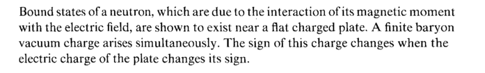 Bound states of a neutron, which are due to the interaction of its magnetic moment with the electric field, are shown to exist near a flat charged plate. A finite baryon vacuum charge arises simultaneously. The sign of this charge changes when the electric charge of the plate changes its sign.