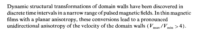 Dynamic structural transformations of domain walls have been discovered in discrete time intervals in a narrow range of pulsed magnetic fields. In thin magnetic films with a planar anisotropy, these conversions lead to a pronounced unidirectional anisotropy of the velocity of the domain walls (Vmax /Vmln > 4).