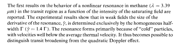 The first results on the behavior of a nonlinear resonance in methane (λ — 3.39 μια) in the transit region as a function of the intensity of the saturating field are reported. The experimental results show that in weak fields the size of the derivative of the resonance, f, is determined exclusively by the homogeneous half-width Γ {γ = 1.4 Γ). The resonance forms primarily because of "cold" particles, with velocities well below the average thermal velocity. It thus becomes possible to distinguish transit broadening from the quadratic Doppler effect.