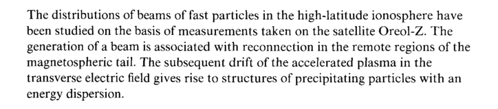 The distributions of beams of fast particles in the high-latitude ionosphere have been studied on the basis of measurements taken on the satellite Oreol-Z. The generation of a beam is associated with reconnection in the remote regions of the magnetospheric tail. The subsequent drift of the accelerated plasma in the transverse electric field gives rise to structures of precipitating particles with an energy dispersion.
