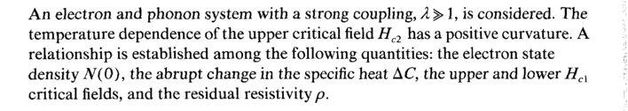 An electron and phonon system with a strong coupling, λ > 1, is considered. The temperature dependence of the upper critical field Hc2 has a positive curvature. A relationship is established among the following quantities: the electron state density N(0), the abrupt change in the specific heat AC, the upper and lower HcX critical fields, and the residual resistivity p.