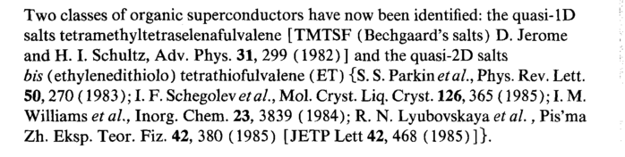 Two classes of organic superconductors have now been identified: the quasi-ID salts tetramethyltetraselenafulvalene [TMTSF (Bechgaard's salts) D. Jerome and Η. I. Schultz, Adv. Phys. 31, 299 (1982) ] and the quasi-2D salts bis (ethylenedithiolo) tetrathiofulvalene (ET) {S. S. Parkinetal, Phys. Rev. Lett. 50,270 (1983); I. F. Schegolev Mol. Cryst. Liq. Cryst. 126,365 (1985); I. M. Williams et al, Inorg. Chem. 23, 3839 (1984); R. N. Lyubovskaya et al , Pis'ma Zh. Eksp. Teor. Fiz. 42, 380 (1985) [JETPLett42, 468 (1985)]}.