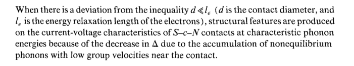 When there is a deviation from the inequality d < le {d is the contact diameter, and le is the energy relaxation length of the electrons), structural fea tures are produced on the current-voltage characteristics of S-c-N contacts at characteristic phonon energies because of the decrease in Δ. due to the accumulation of nonequilibrium phonons with low group velocities near the contact.