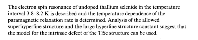 The electron spin resonance of undoped thallium selenide in the temperature interval 3.8-8.2 К is described and the temperature dependence of the paramagnetic relaxation rate is determined. Analysis of the allowed superhyperfine structure and the large hyperfine structure constant suggest that the model for the intrinsic defect of the TISe structure can be used.