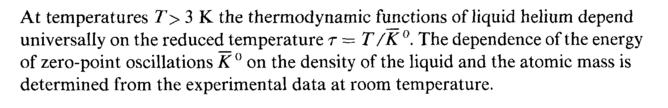 At temperatures T> 3 К the thermodynamic functions of liquid helium depend universally on the reduced temperature r~ T/K°. The dependence of the energy of zero-point oscillations К 0 on the density of the liquid and the atomic mass is determined from the experimental data at room temperature.