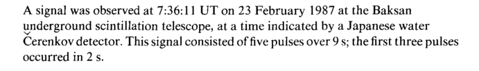A signal was observed at 7:36:11 UT on 23 February 1987 at the Baksan underground scintillation telescope, at a time indicated by a Japanese water Cerenkov detector. This signal consisted of five pulses over 9 s; the first three pulses occurred in 2 s.
