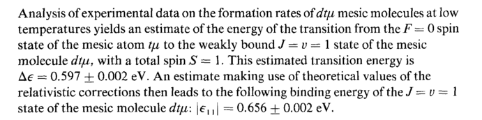 Analysis of experimental data on the formation rates of άΐμ mesic molecules at low temperatures yields an estimate of the energy of the transition from the F = 0 spin state of the mesic atom ΐμ to the weakly bound J — υ — 1 state of the mesic molecule άΐμ, with a total spin 5=1. This estimated transition energy is = 0.597 + 0.002 eV. An estimate making use of theoretical values of the relativistic corrections then leads to the following binding energy of the J = υ = 1 state of the mesic molecule άΐμ: \eu \ = 0.656 + 0.002 eV.