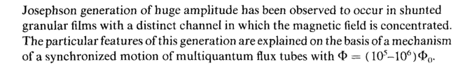 Josephson generation of huge amplitude has been observed to occur in shunted granular films with a distinct channel in which the magnetic field is concentrated. The particular features of this generation are explained on the basis of a mechanism of a synchronized motion of multiquantum flux tubes with Φ = (105-106)Φ0.