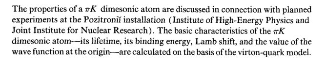 The properties of а ίγΚ dimesonic atom are discussed in connection with planned experiments at the Pozitronii installation (Institute of High-Energy Physics and Joint Institute for Nuclear Research). The basic characteristics of the πΚ dimesonic atom—its lifetime, its binding energy, Lamb shift, and the value of the wave function at the origin—are calculated on the basis of the virton-quark model.