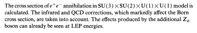 The cross section of e+e ~ annihilation in SU (3) X SU (2) X U (1) X U (1) model is calculated. The infrared and QCD corrections, which markedly aifect the Born cross section, are taken into account. The effects produced by the additional ZE boson can already be seen at LEP energies.