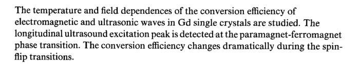The temperature and field dependences of the conversion efficiency of electromagnetic and ultrasonic waves in Gd single crystals are studied. The longitudinal ultrasound excitation peak is detected at the paramagnet-ferromagnet phase transition. The conversion efficiency changes dramatically during the spin-flip transitions.