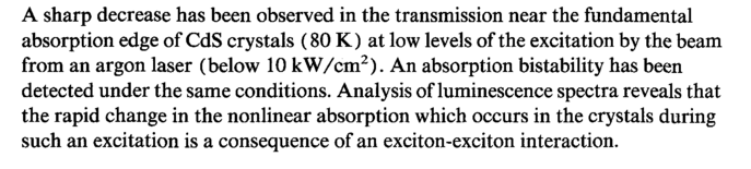 A sharp decrease has been observed in the transmission near the fundamental absorption edge of CdS crystals (80 K) at low levels of the excitation by the beam from an argon laser (below 10 kW/cm2). An absorption bistability has been detected under the same conditions. Analysis of luminescence spectra reveals that the rapid change in the nonlinear absorption which occurs in the crystals during such an excitation is a consequence of an exciton-exciton interaction.