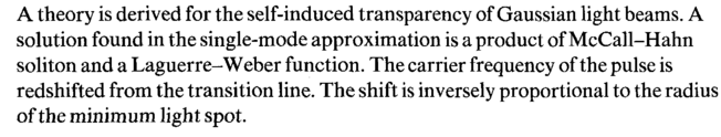 A theory is derived for the self-induced transparency of Gaussian light beams. A solution found in the single-mode approximation is a product of McCall-Hahn soliton and a Laguerre-Weber function. The carrier frequency of the pulse is redshifted from the transition line. The shift is inversely proportional to the radius of the minimum light spot.