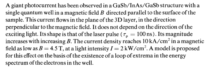 A giant photocurrent has been observed in a GaSb/InAs/GaSb structure with a single quantum well in a magnetic field В directed parallel to the surface of the sample. This current flows in the plane of the 3D layer, in the direction perpendicular to the magnetic field. It does not depend on the direction of the exciting light. Its shape is that of the laser pulse (rp = 100 ns). Its magnitude increases with increasing B. The current density reaches 10 kA/cm2 in a magnetic field as low as В = 4.5 Τ, at a light intensity 1=2 kW/cm2. A model is proposed for this effect on the basis of the existence of a loop of extrema in the energy spectrum of the electrons in the well.