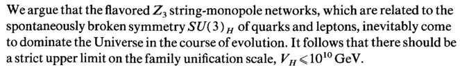 We argue that the flavored Z3 string-monopole networks, which are related to the spontaneously broken symmetry SU(3) H of quarks and leptons, inevitably come to dominate the Universe in the course of evolution. It follows that there should be a strict upper limit on the family unification scale, VH < 1010 GeV.