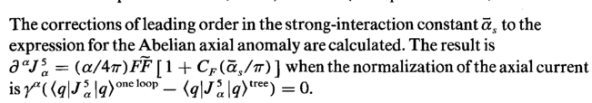 The corrections of leading order in the strong-interaction constant as to the expression for the Abelian axial anomaly are calculated. The result is daJsa — (a/Air)FF [I + CF(as/n) ] when the normalization of the axial current